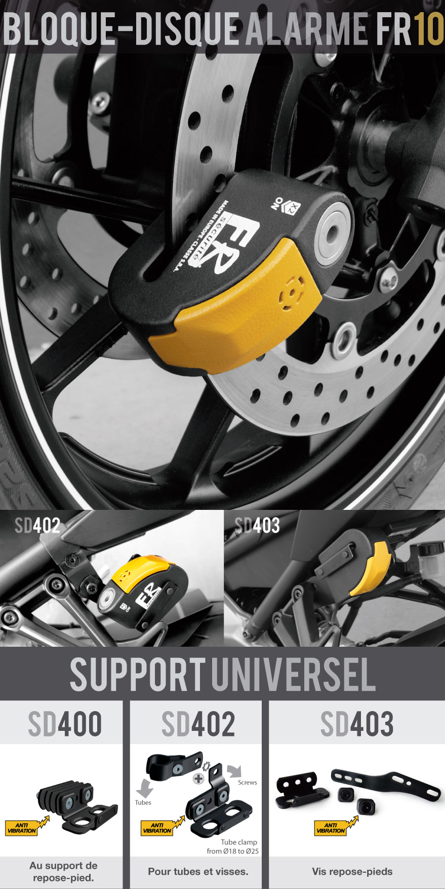 BLOQUE-DISQUE+ALARME+AVERTISSEUR: Fonction alarme + fonction avertisseur, le capteur intelligent sait faire la différence entre une tentative de vol ou un oubli. Le moindre mouvement activera l´avertisseur de bips progressifs réservant l´ALARME pour une vraie tentative de vol, en augmentant son efficacité et la vie de ses piles. |