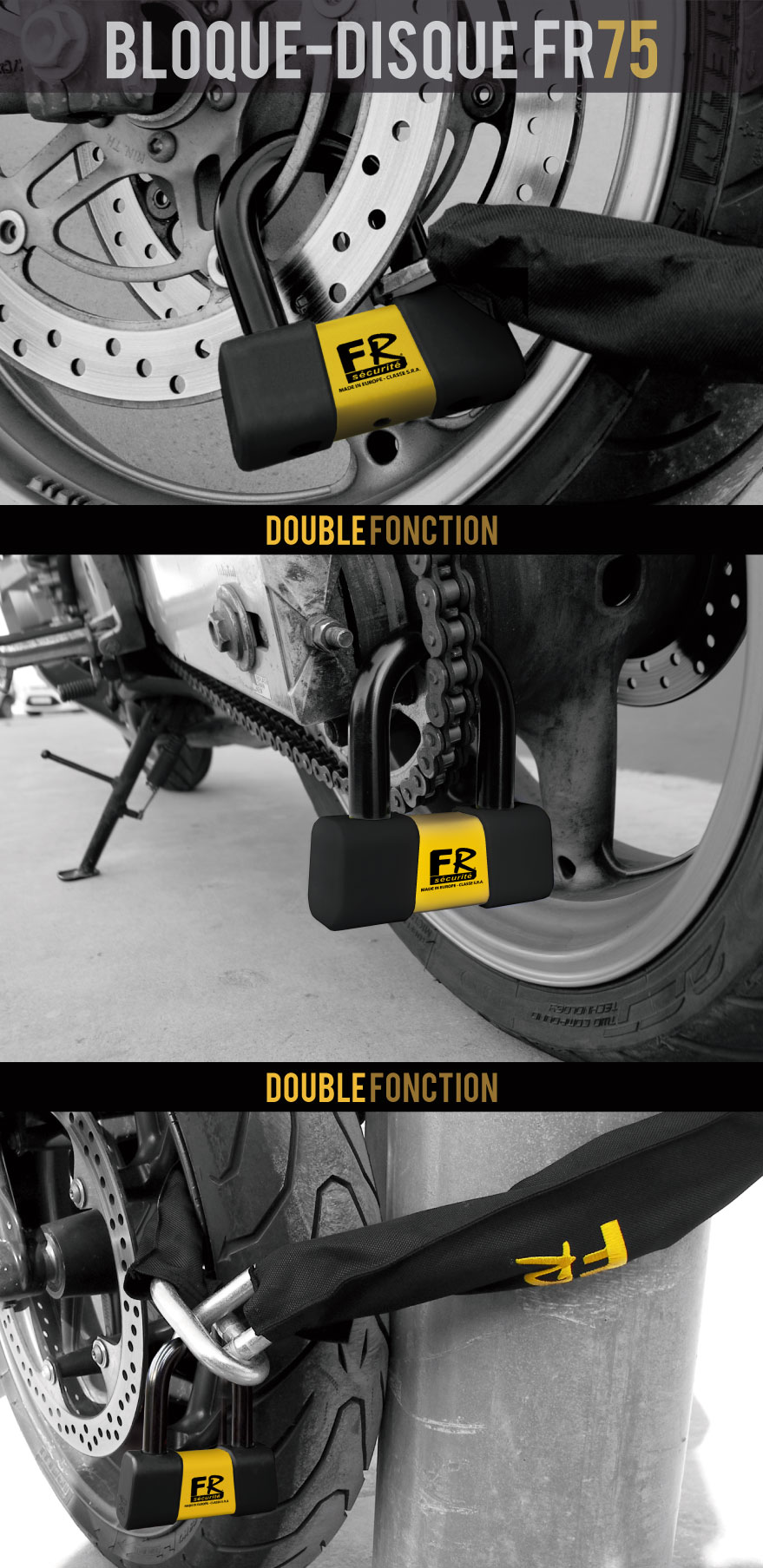 Double fonction: bloque disque solide á combiner aussi avec une chaîne. |